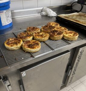 J’arrive donc à la boulangerie presque en même temps qu’E. Il me demande de pétrir la pâte à croissant, ce que je fais. Il ne vient même pas vérifier ce que je fais me laissant de plus en plus d’autonomie. C’est plaisant. J’ai récupéré mon calepin pour avoir les temps de pétrissage et me remémorer ce que je dois faire après… diviser, bouler, aplatir et mettre au froid. Pareil, il m’a sorti le beurre de tourage et me demande de le préparer sans me donner aucune indication. Ca fait plaisir la confiance qu’il a même s’il sait que je n’hésiterais pas à venir le voir en cas de soucis. Je prépare le beurre de tourage et je le mets également au frais. Ensuite je m’attèle à faire le pudding graine de chia, je n’ai plus besoin de recettes car je le prépare à chaque fois, puis je fais l’appareil à quiche (lait, crème, œuf) et je garnis les quiches avec les légumes et le gruyère râpé.