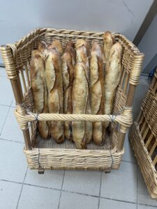Durant la matinée, PF. va façonner de nombreuses traditions. Je me sens de plus en plus à l’aise avec le façonnage des traditions même si parfois ça reste un peu aléatoire. Vers midi, c’est à moi de débaquer la pâte à tradition, de la diviser puis de les façonner et de les cuire. Le plus dur reste toujours de placer les baguettes tradition sur le tapis enfourneur en utilisant la paline, parfois ça colle donc la baguette ne se positionne pas bien et se tord. Je teste aussi différents coups de grigne sur le pain, une seule scarification, où je trouve que le rendu est le plus joli, ou trois coups de lame, ce qui permet de m’entrainer pour ce qui est attendu le jour du CAP. Je vous mets en photo une fournée de traditions que j’ai réalisée, pas si mal pour un débutant non ?