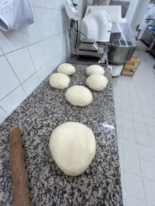 Enfin à partir de 10 heures je me retrouve seul au fournil comme d’habitude pour réaliser les traditions, généralement PF. laisse 4 bacs entiers pour le reste de la journée, un bac représente entre 22 et 24 traditions, soit environ 90 traditions. Chaque bac est divisé en pâtons qui sont laissés en détente puis façonnés et laissés en apprêt. Je pensais que la journée allait être assez calme car on avait beaucoup de bacs d’avance, mais on s’est pris la foudre d’un seul coup !! Je pars vers 13h – 13h30 en ayant fait les quatre bacs ! Un vrai travail à la chaine, non stop, mais je suis content car ça m’entraine à manipuler la pâte et le four. Fatigué, je rentre chez moi (avec une de mes traditions), c’est l’heure de manger et de dormir.