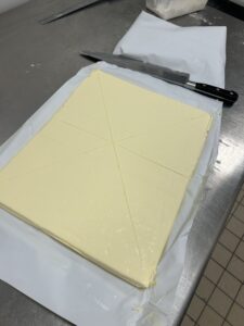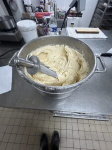 Mardi 30 septembre 2025, 2h30 : c’est reparti pour une semaine qui va de nouveau être épuisante physiquement avec peu de sommeil en perspective. J’ai encore une opération policière demain matin, je vais donc me lever tôt deux fois de suite avec une journée en continue jusqu’au soir. Pas de quoi entamer mon moral, le mardi c’est pâte levée feuilletée, ce qui signifie préparation de viennoiseries ! J’arrive à la boulangerie, E. a la voix enroué, il est malade mais il vient quand même travailler sans rechigner. J’ai bien compris que dans ce monde de la boulangerie, les gens sont durs au mal, ils ne sont pas en arrêt pour un oui ou pour un non. Ils ne sont pas souvent absents ou en vacances. Ca change de quelques (rares) personnes que j’ai pu côtoyer dans l’administration. S’il n’est pas présent à son travail, c’est toute la production de pâtisserie qui s’effondre, pareil pour PF. et la production de pains. Ce sont des travailleurs et j’aime ça. E. me met donc à la pâte à croissant, c’est pas moins de 20kg de farine que je vais utiliser pour environ 33kg de pâte ! Pâte que je vais pétrir, décuver, diviser, bouler, aplatir et tourer.