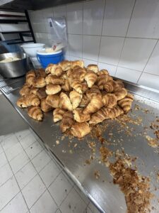 Samedi 4 octobre 2025, 2h30 : sans surprise, réveil très difficile aujourd’hui, j’ai vraiment besoin de sommeil. Cet après-midi après mon stage, une grosse sieste s’imposera. Je sors de chez moi m’attendant à affronter un froid polaire, mais non il fait 18 degrés à 3 heures du matin.. le vente souffle fort, c’est la tempête Amy. Arrivé dans le fournir, je retrouve E., je sais déjà ce qu’il va me demander aujourd’hui, préparation de la sauce pour la tarte grand mère. Je vois sur le bord d’un plan de travail des sacs remplis de croissants et de pains au chocolat, je demande ce qu’on va en faire, E. me répond que c’est pour faire des croissants et pains au chocolat aux amandes (une de mes viennoiseries préférées). Alors je vais peut être vous apprendre un truc qui va vous surprendre, en tout cas moi ça m’a surpris… les croissants et pains chocolats aux amandes sont faits à partir des invendus ! Et oui, et dans le monde de la boulangerie, les faire est apparemment considéré comme un bizutage. Par la même occasion, on évite le gaspillage. Je veux connaitre le procédé alors je me propose de les faire. Il faut commencer par réaliser un sirop 500g de sucre pour un litre d’eau, j’en fais 3 litres. On chauffe dans une marmite jusqu’à dissolution.