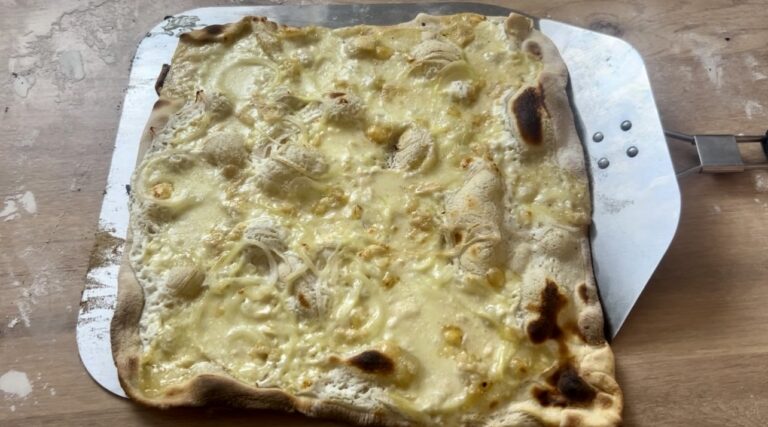 La flammekueche, aussi appelée tarte flambée, est une spécialité emblématique d’Alsace. Son nom vient de l’alsacien Flàmmeküeche, littéralement « tarte cuite à la flamme ». À l’origine, elle n’était pas pensée comme un plat à part entière, mais comme un test de température du four à pain : on étalait une pâte très fine, on la garnissait rapidement, puis on l’enfournait quelques minutes pour vérifier que le four était assez chaud avant d’y cuire le pain.