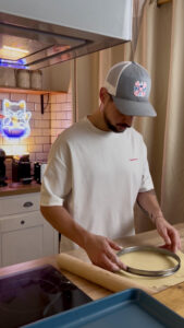 Mélange le beurre et le sucre glace, puis ajoute l’œuf, l’eau et la farine. Abaisse la pâte et fonce un cercle à tarte de 22cm. -